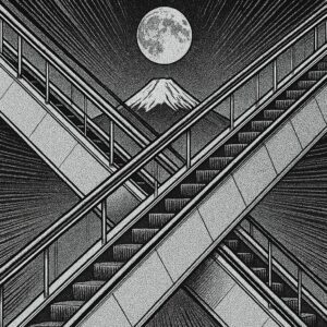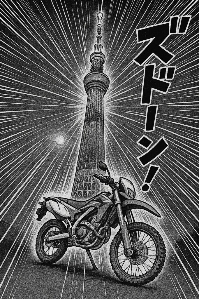 - 電柱や標識がバイクや車を貫くように配置される構図
